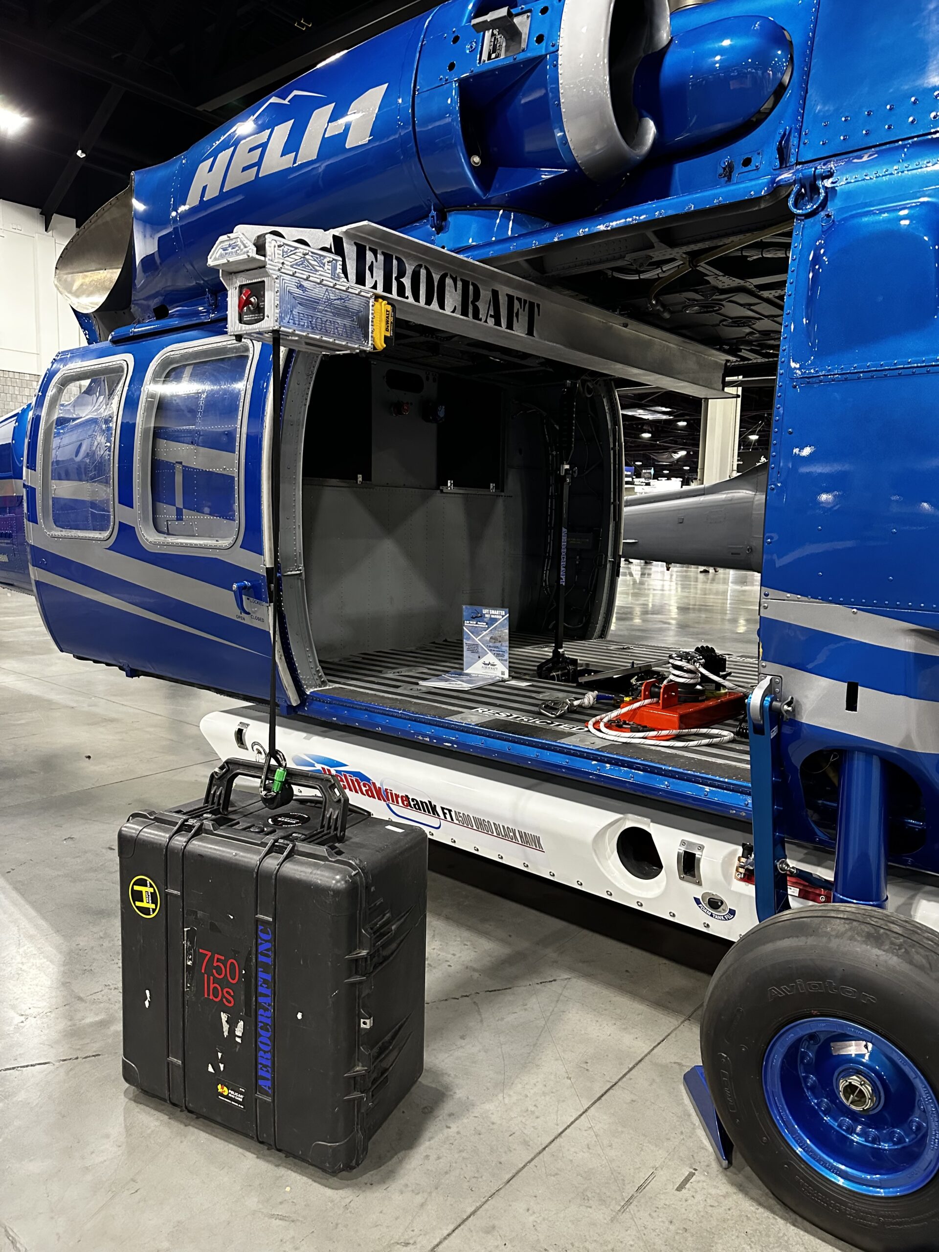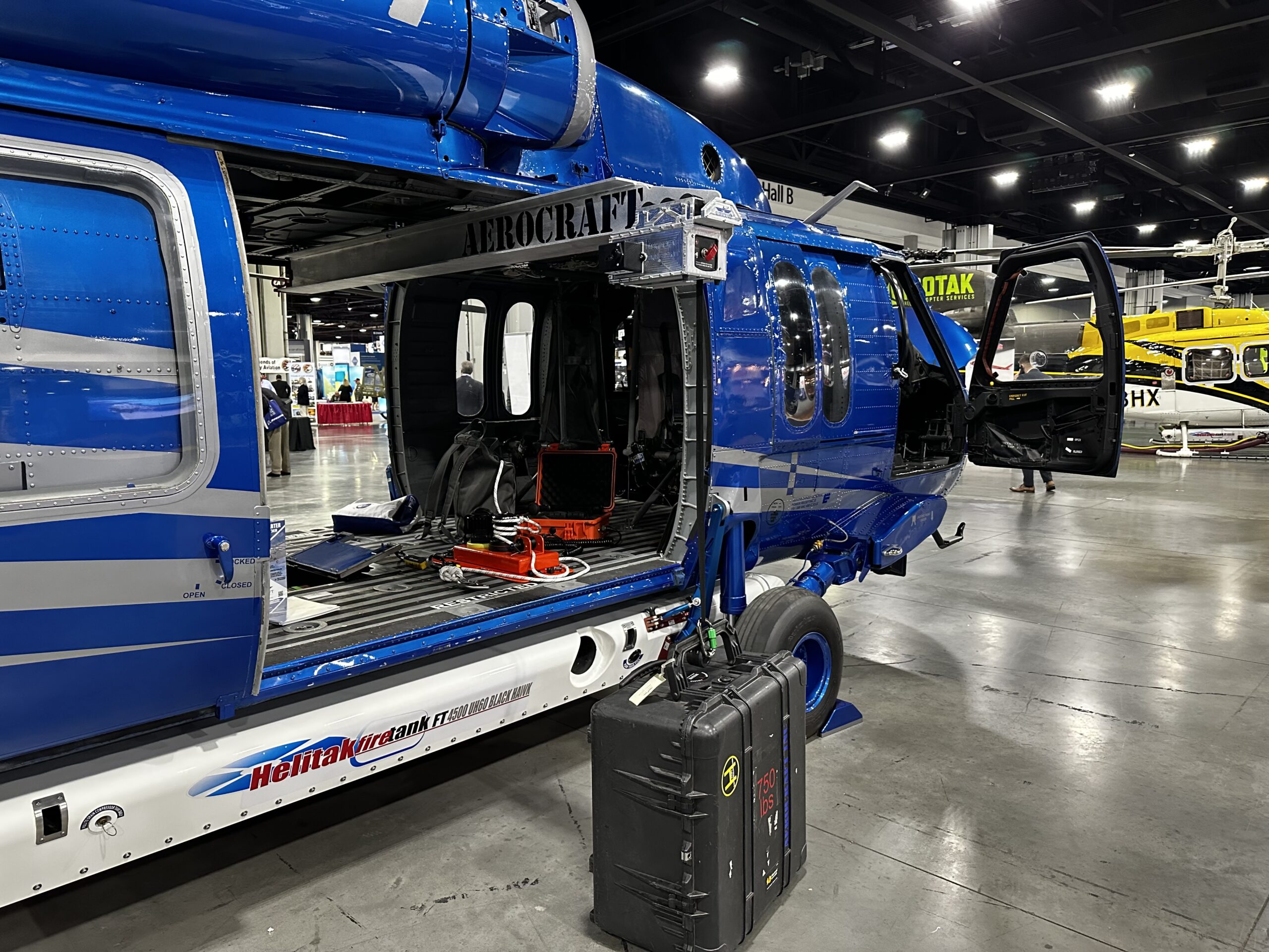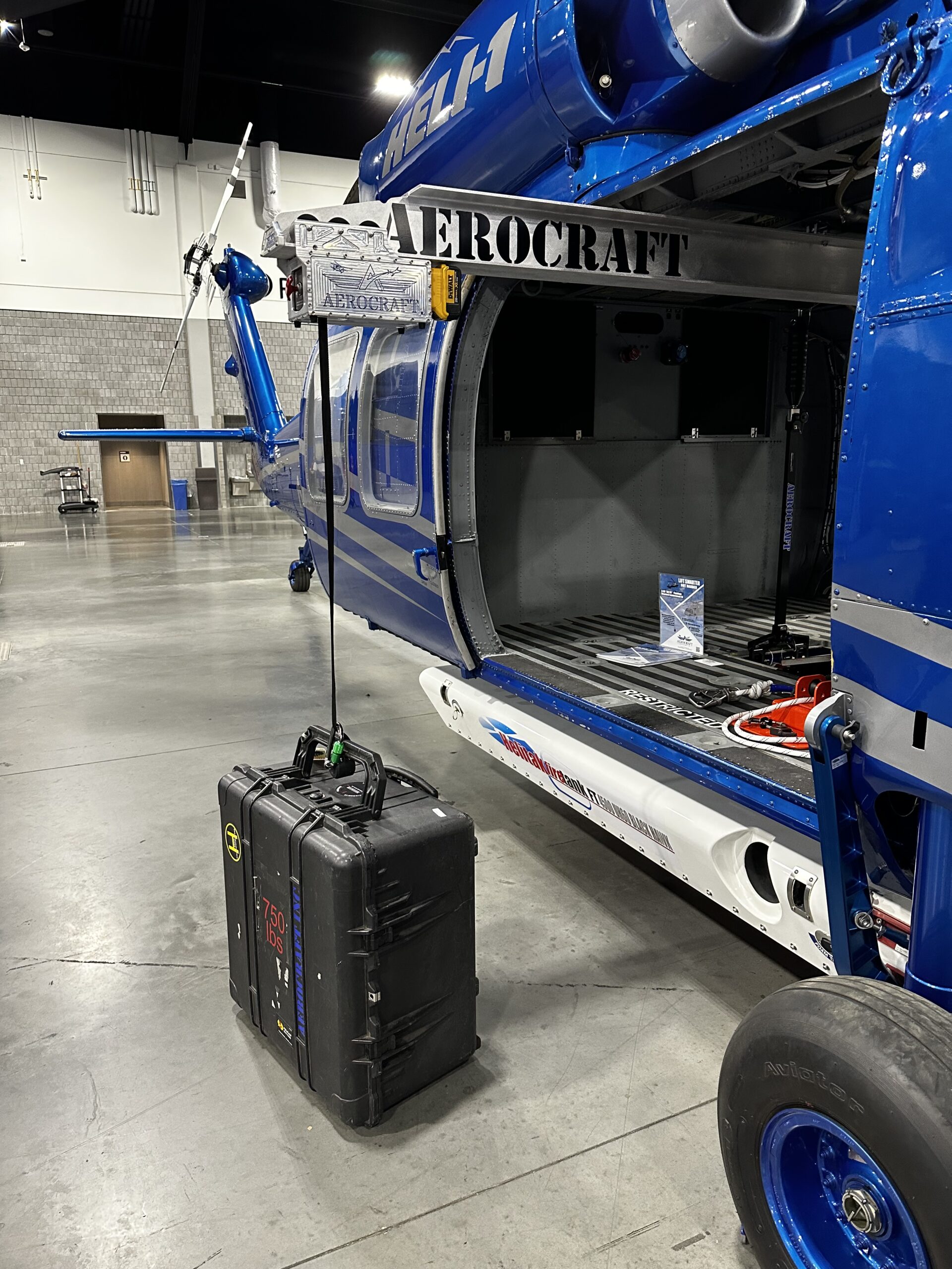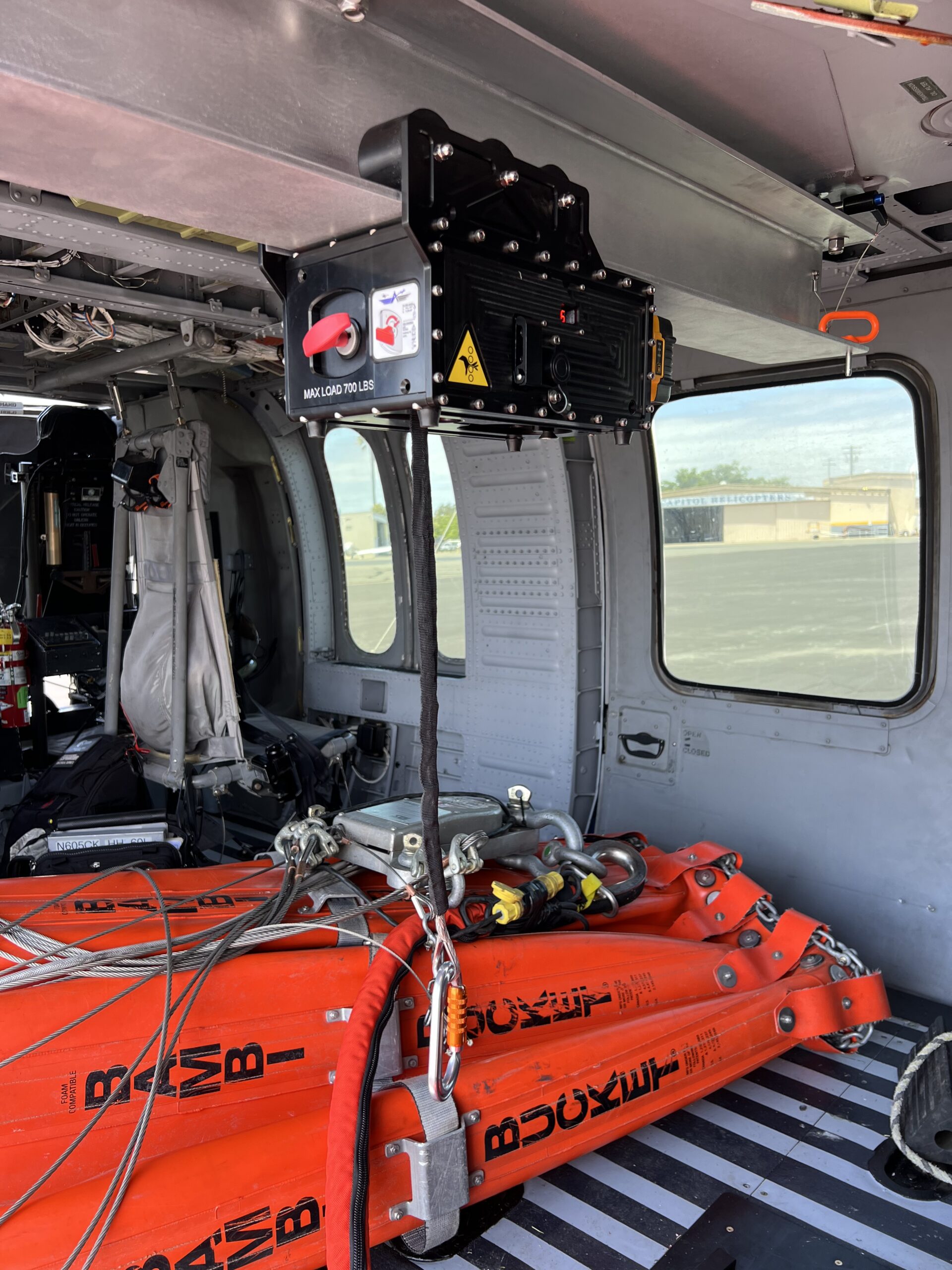 The Aerocraft H-60 Beam Loader installs onto the fuselage to provide a means to easily lift and load up to 750 lbs of cargo into the cabin of H-60 series helicopters. A wireless, battery powered winch and trolley allows for effortless loading of firefighting buckets and/or cargo.