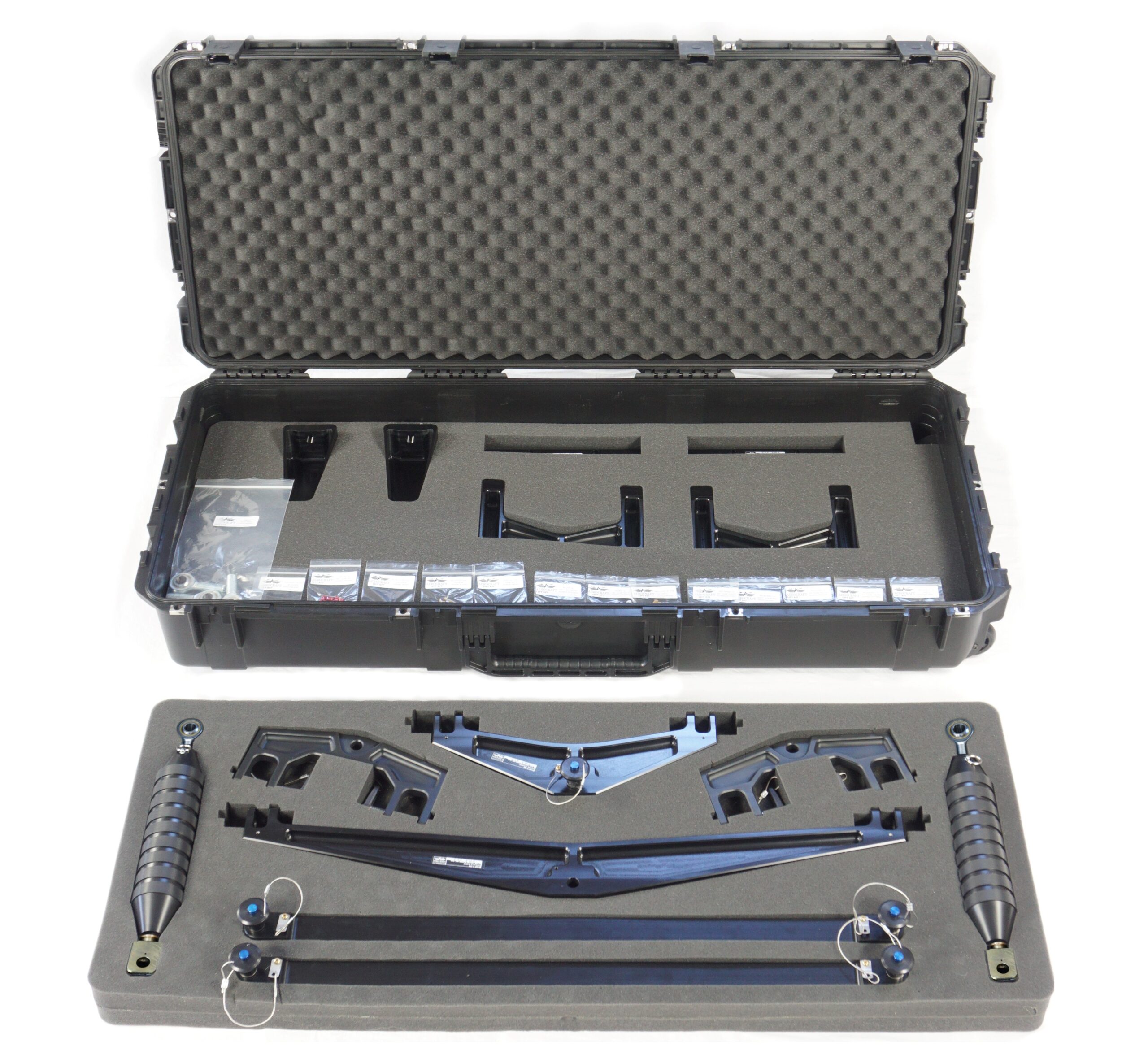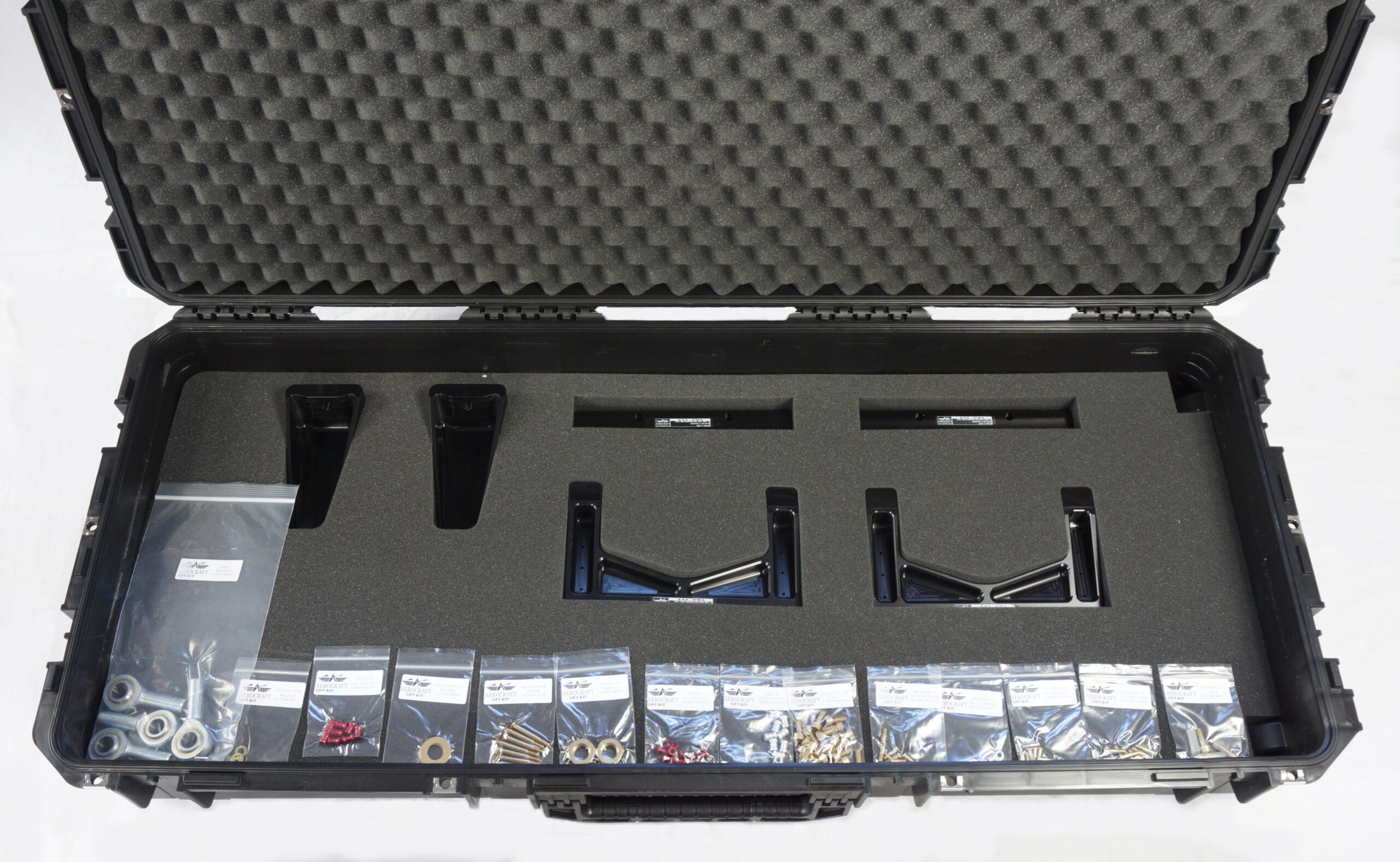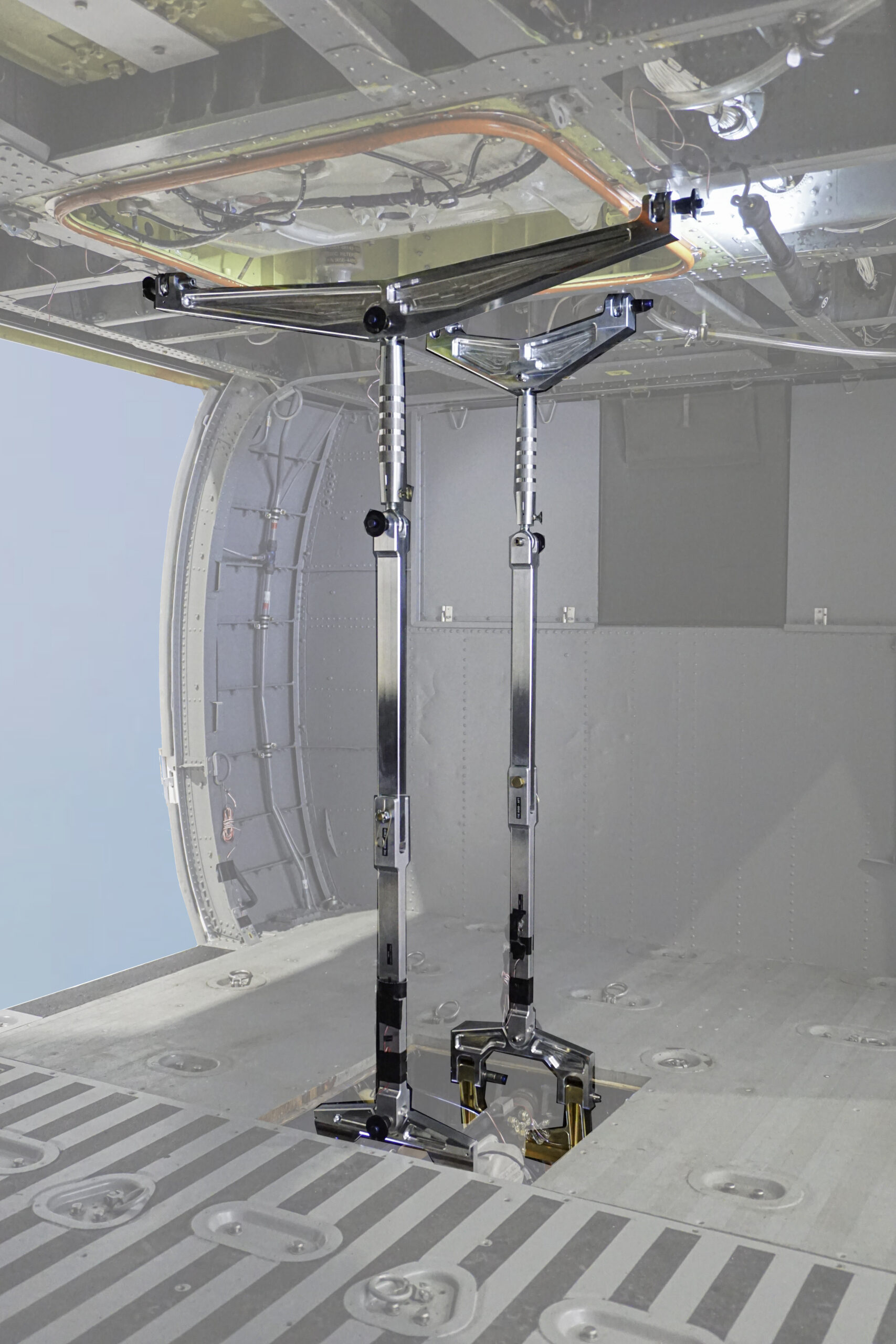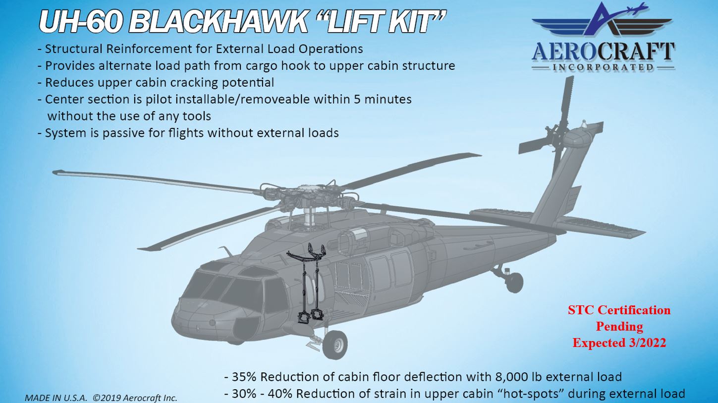 The Aerocraft Inc. Lift Kit System is a structural reinforcement kit for the H-60 series helicopter fuselage when performing external load operations. The Lift Kit System consists of machined aluminum structural provisions, and the removable lift components that pin together to create a load path from the transmission to the cargo hook. The Structural Provisions permanently attach to the aircraft at the lower cargo hook-well and upper cabin structure. The lift components (“removable components”) are pilot removable and can be stowed in the provided case when not in use.