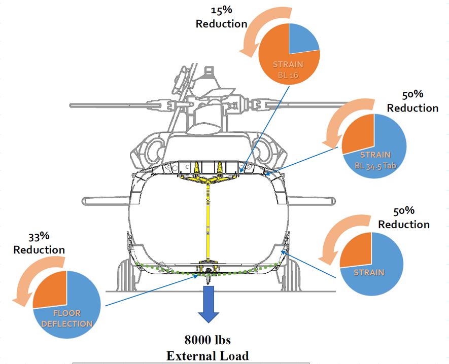 The Lift Kit System provides an alternate load path when lifting using the H-60 series helicopter, reduces fuselage deflection under load, and can help mitigate costly damage to the fuselage of the helicopter.
